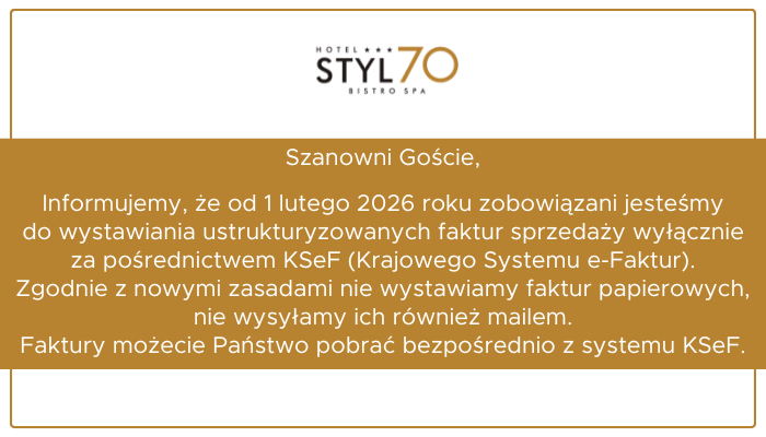 Wybierasz się na Śląsk? Wybierz hotel w Pszczynie - Hotel Styl 70***. Wnętrza są inspirowane amerykańskimi latami 70, stąd nazwa Styl 70. W Bistro 70 odnajdą Państwo szlaki międzynarodowych, polskich i regionalnych śląskich kulinarnych historii w nowoczesnej odsłonie. Planeta 70 SPA to miejsce, w której nasi Goście mogą odbyć międzyplanetarną podróż po kosmicznym relaksie w formie masażu egzotycznego, zabiegów pielęgnacyjnych i relaksacyjnych.